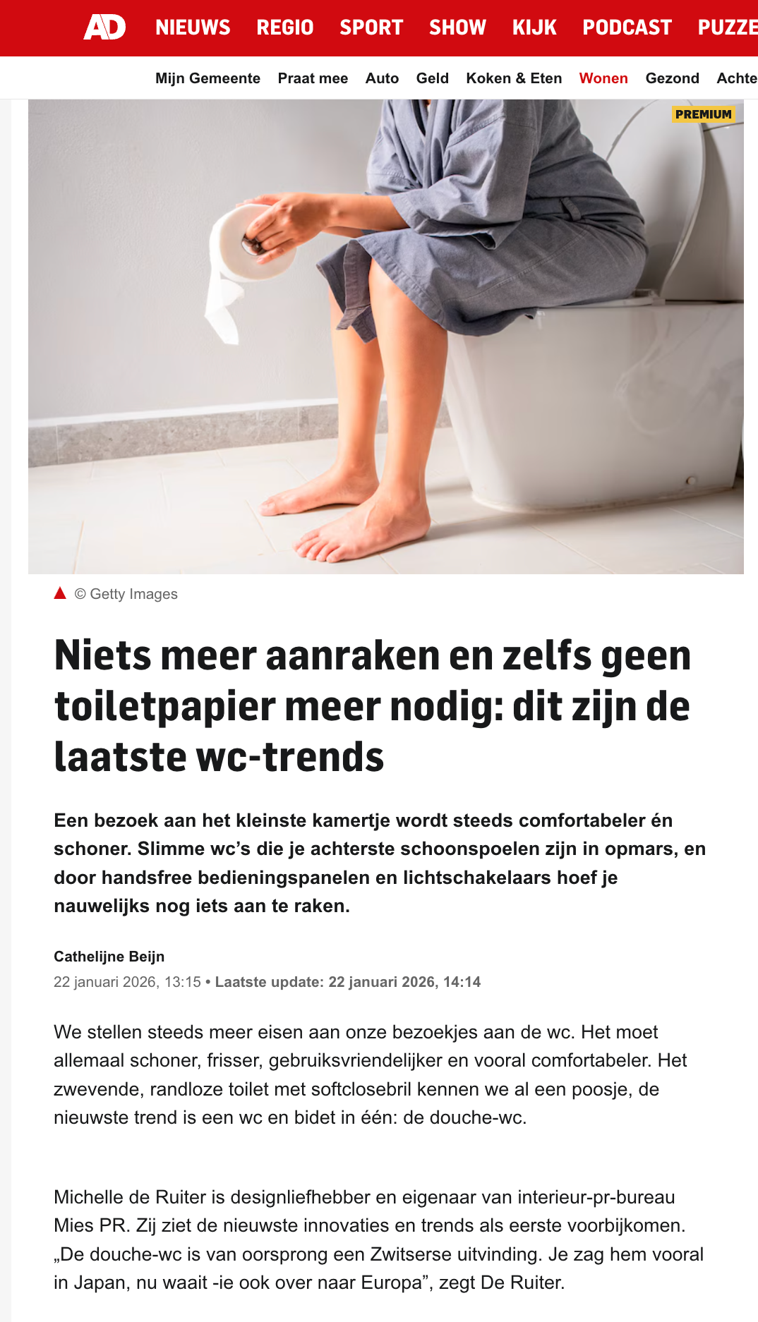 Recently, Michelle, founder and owner of our interior PR agency MIES PR, was interviewed by Algemeen Dagblad about the latest toilet trends. Drawing on her expertise in interiors, design and sanitary solutions, and her many years of working with brands in this field. The result was an in-depth article published in ten major regional newspapers affiliated with AD.