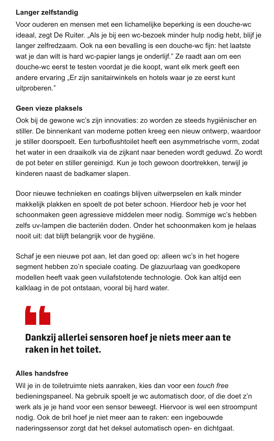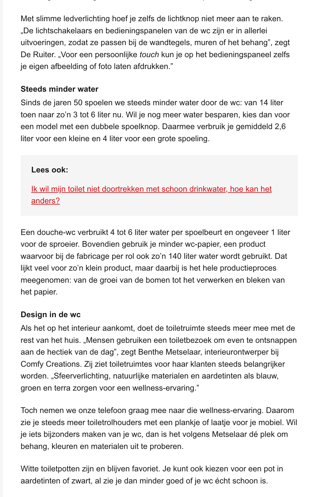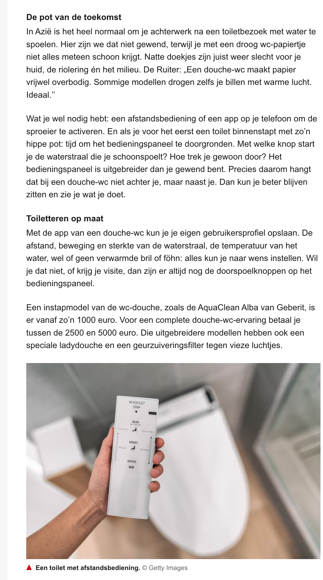 The topic “The rise of the shower toilet” did not go unnoticed. After publication, the theme was picked up by the radio news at Qmusic and Radio 538, where the trend was further discussed on air. From newspaper page to radio show: visibility with serious reach.