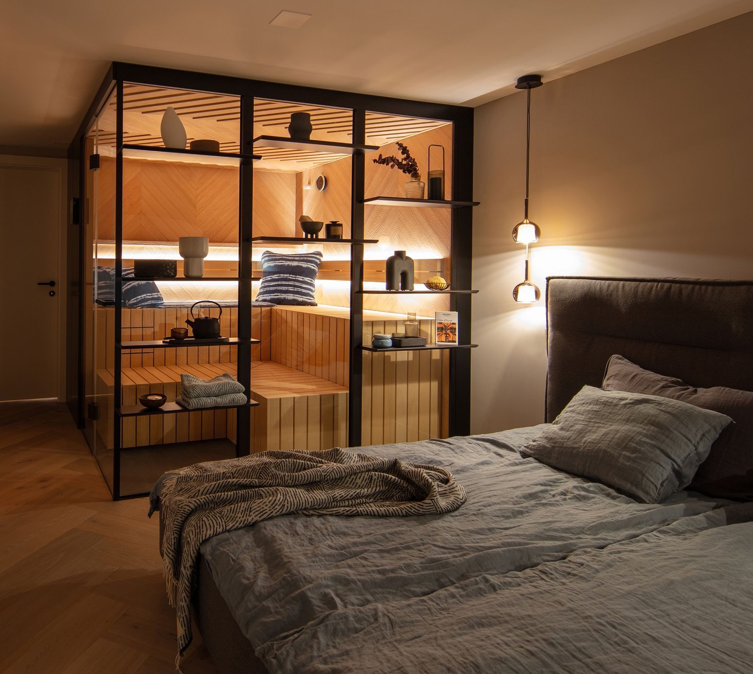 Dankzij de royale glaspartijen en het unieke planchetsysteem aan de buitenzijde biedt de sauna GESA nature een open en luchtig karakter. De planchetten creëren extra ruimte voor decoratieve accessoires, waardoor de sauna niet alleen functioneel is, maar ook een stijlvol designelement vormt in de ruimte. De grote isolatieglasfronten laten maximaal licht door en verbinden de sauna op elegante wijze met de rest van het interieur. Waar traditionele houten sauna’s de ruimte vaak visueel verkleinen, creëert GESA nature juist een gevoel van ruimte en harmonie.