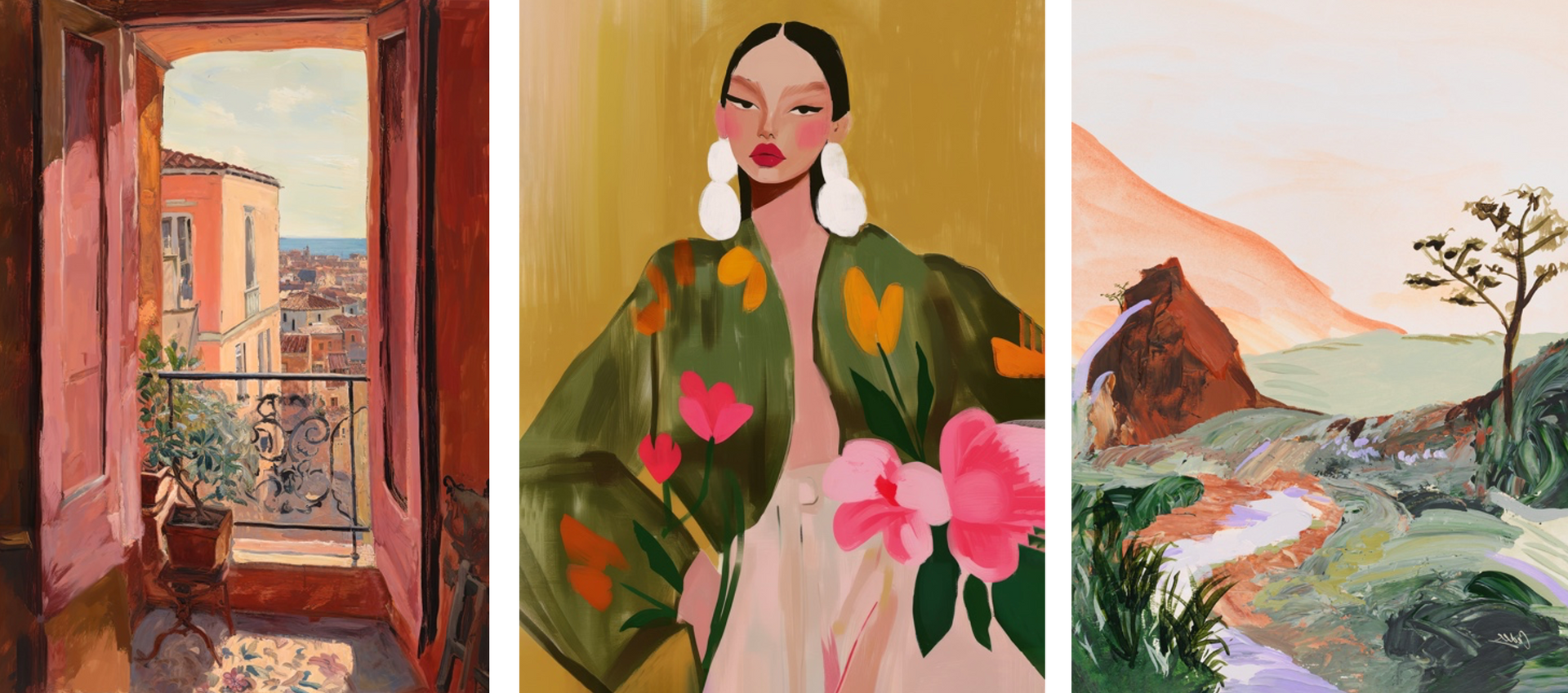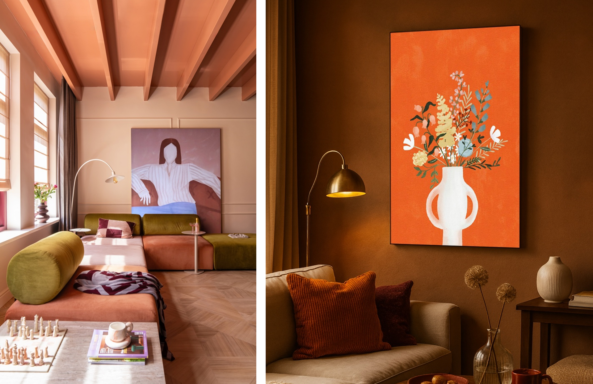 Waar de afgelopen jaren werden gekenmerkt door beige, greige en minimalistische Japandi-invloeden, laten de data nu een duidelijke groei zien in kunstwerken met terracotta, oranje- en abrikoostinten. Ook koraal, zachtroze en warme geelnuances stijgen in populariteit, terwijl koelere groenen, blauwen en grijzen licht teruglopen.