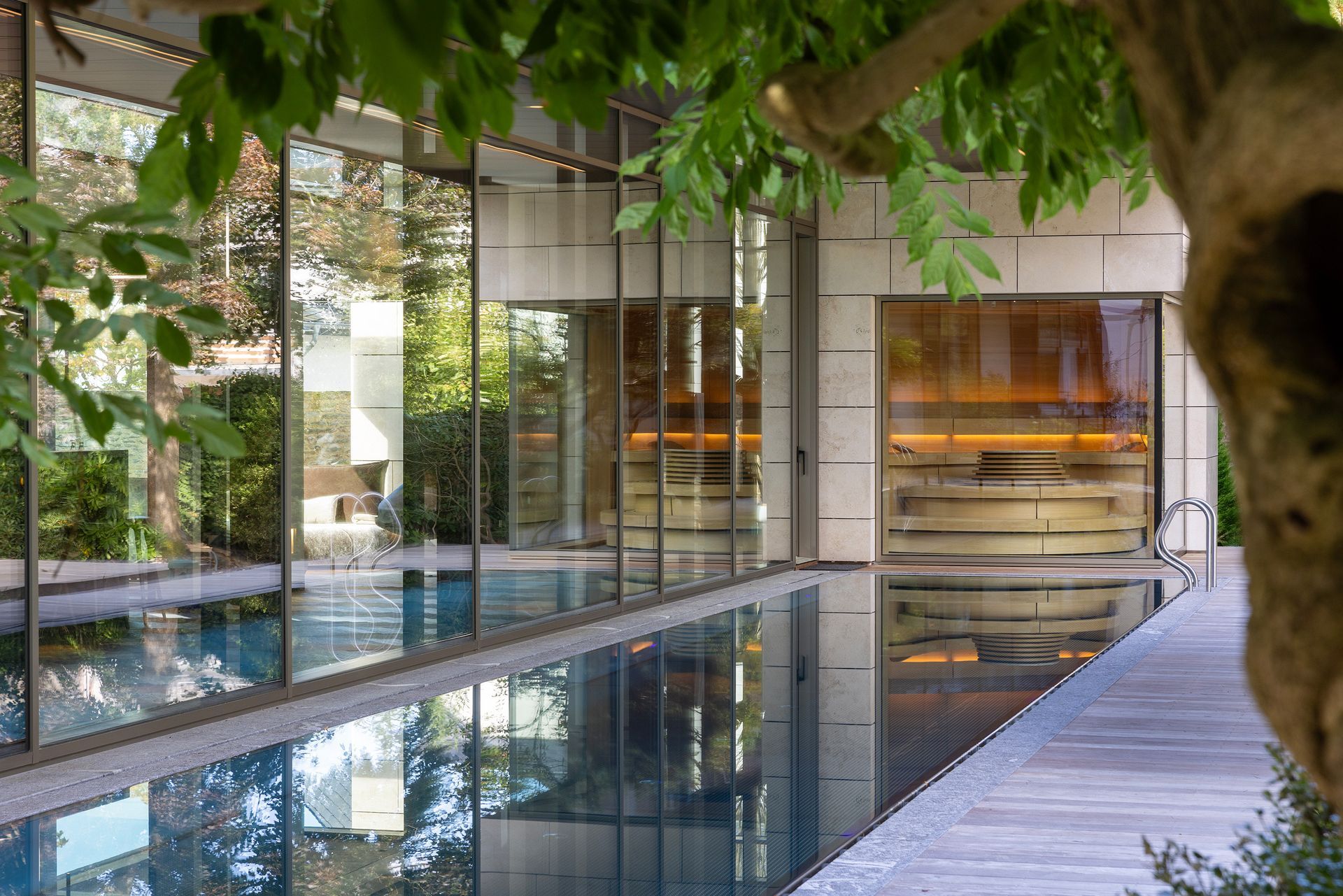 Het aangrenzende zwembad en de volledig uitgeruste fitnessruimte completeren het geheel en bieden alles wat een moderne wellnessoase nodig heeft. Zo wordt de sauna, net als de wijn, een expressie van exclusiviteit en levenskunst, een eerbetoon aan de traditierijke Saar en de verfijnde smaak van de opdrachtgever.