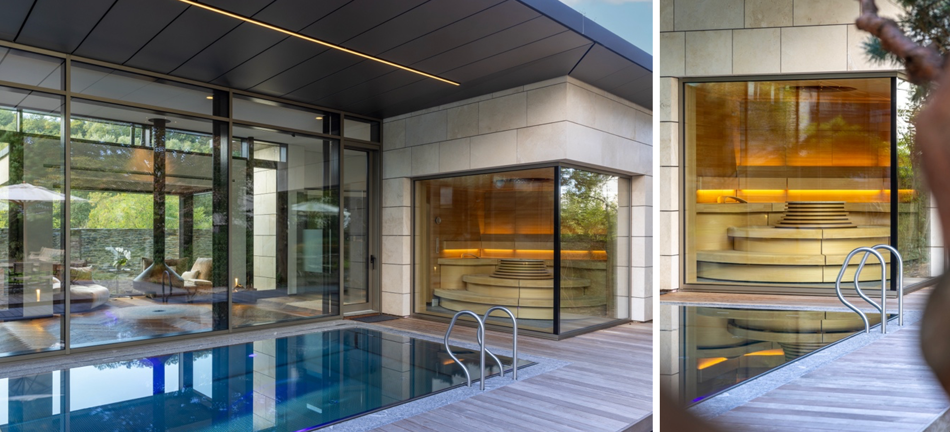 Voor de privésauna legde de opdrachtgever de nadruk op een individuele vormgeving waarin precisie en vakmanschap samenkomen met comfort en exclusief design. In de balans tussen hedendaagse architectuur en het behoud van het historische landgoed ontstond een exclusieve plek van rust, die zich elegant voegt in het totaalconcept. De wens was een saunakachel met de uitstraling van een open haard, als centraal element in de ruimte en bedoeld om een warme, intieme kampvuursfeer te creëren. Met de exclusieve DOME sauna wist KLAFS deze visie op overtuigende wijze te realiseren.