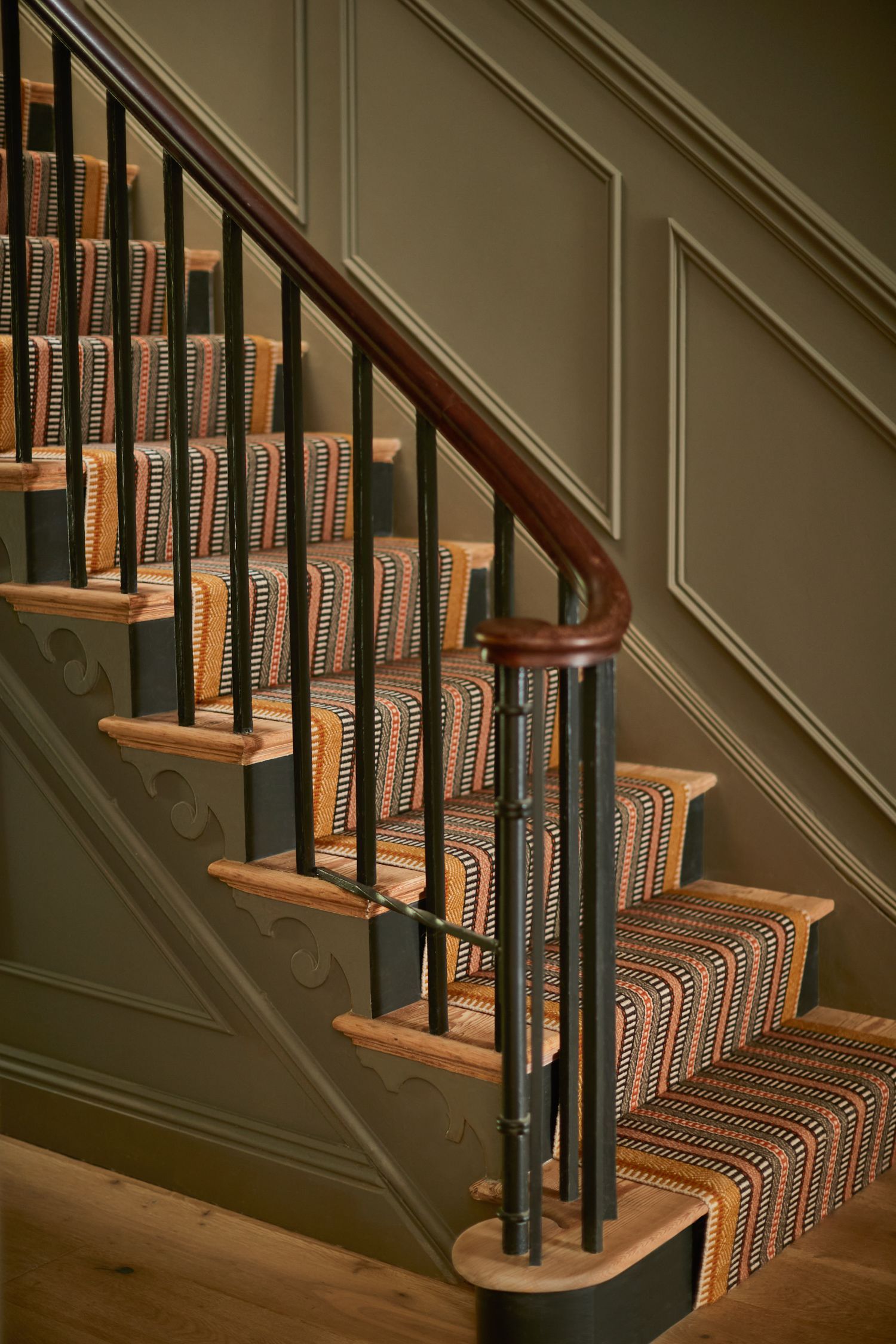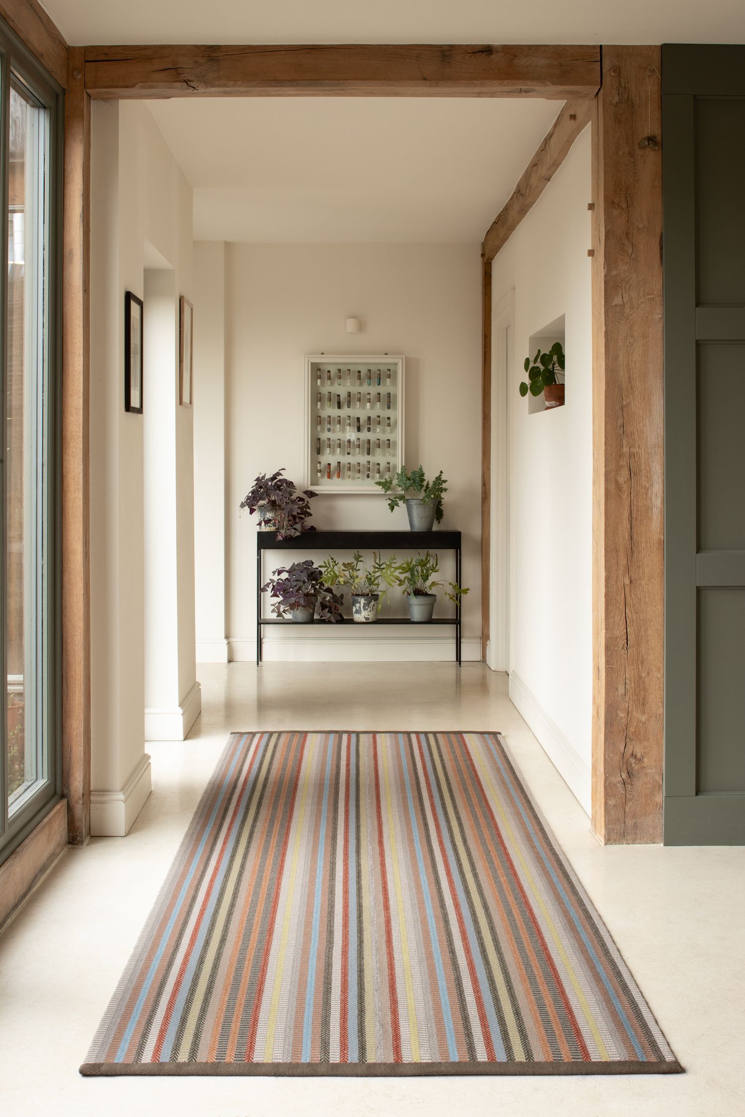 De reis van Roger Oates begint in de jaren ’80, toen Roger en zijn vrouw Fay geïnspireerd raakten door traditionele weeftechnieken. Ze wilden de eeuwenoude kunst van handgeweven stoffen nieuw leven inblazen voor de moderne tijd en begonnen met het ontwerpen van unieke traplopers, waarbij het gestreepte patroon al snel hun kenmerk werd. Dit iconische ontwerp is uitgegroeid tot een vaste waarde in de collectie en wordt toegepast in uiteenlopende interieurs, van monumentale landhuizen tot eigentijdse nieuwbouwwoningen.