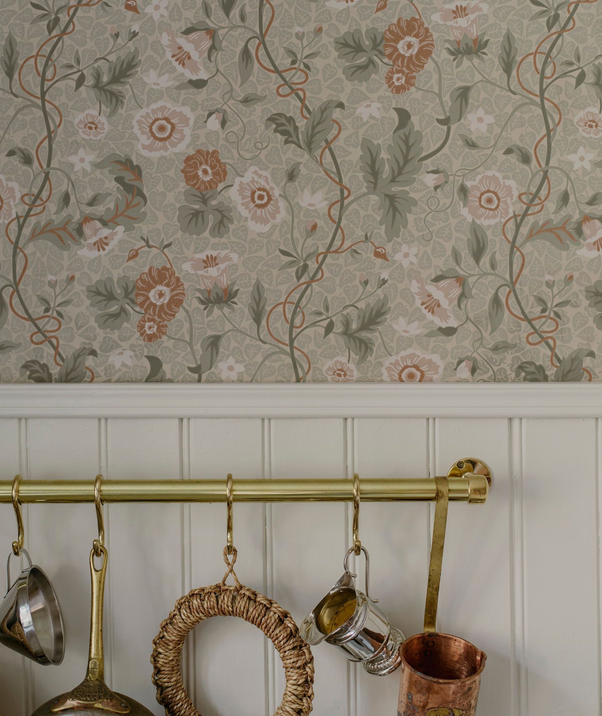 - Charlotta – Klaprozen dansend in de wind, omhuld door kronkelend loof en verfijnde details. Het patroon is geïnspireerd op een prachtig ontworpen origineel behang in het Bogesundkasteel in Zweden.